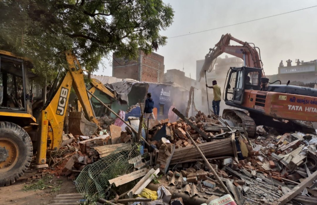 શહેરમાં ગેરકાયદે બનાવેલા બાંધકામને તોડી પાડવા માટે કોર્પોરેશને રીતસરની ઝુંબેશ ઉઠાવી છે. જેમાં જુદા જુદા વિસ્તારમાં નીતિ-નિયમ વિના સરકારી જમીન પર બનેલા મકાન તથા દુકાન-ઓટલાને તોડી પાડી જમીન ખુલ્લી કરવા માટે કામગીરી શરૂ કરવામાં આવી છે. શનિવારે સવારથી સાબરમતી વિસ્તારમાં મોટેરા સ્ટેડિયમથી નજીક પતરાના શેડવાળા મકાન તોડી પાડવામાં આવ્યા હતા. ચારથી પાંચ બુલ્ડોઝરની મદદથી મકાન તોડી જગ્યા ખુલ્લી કરવામાં આવી છે.